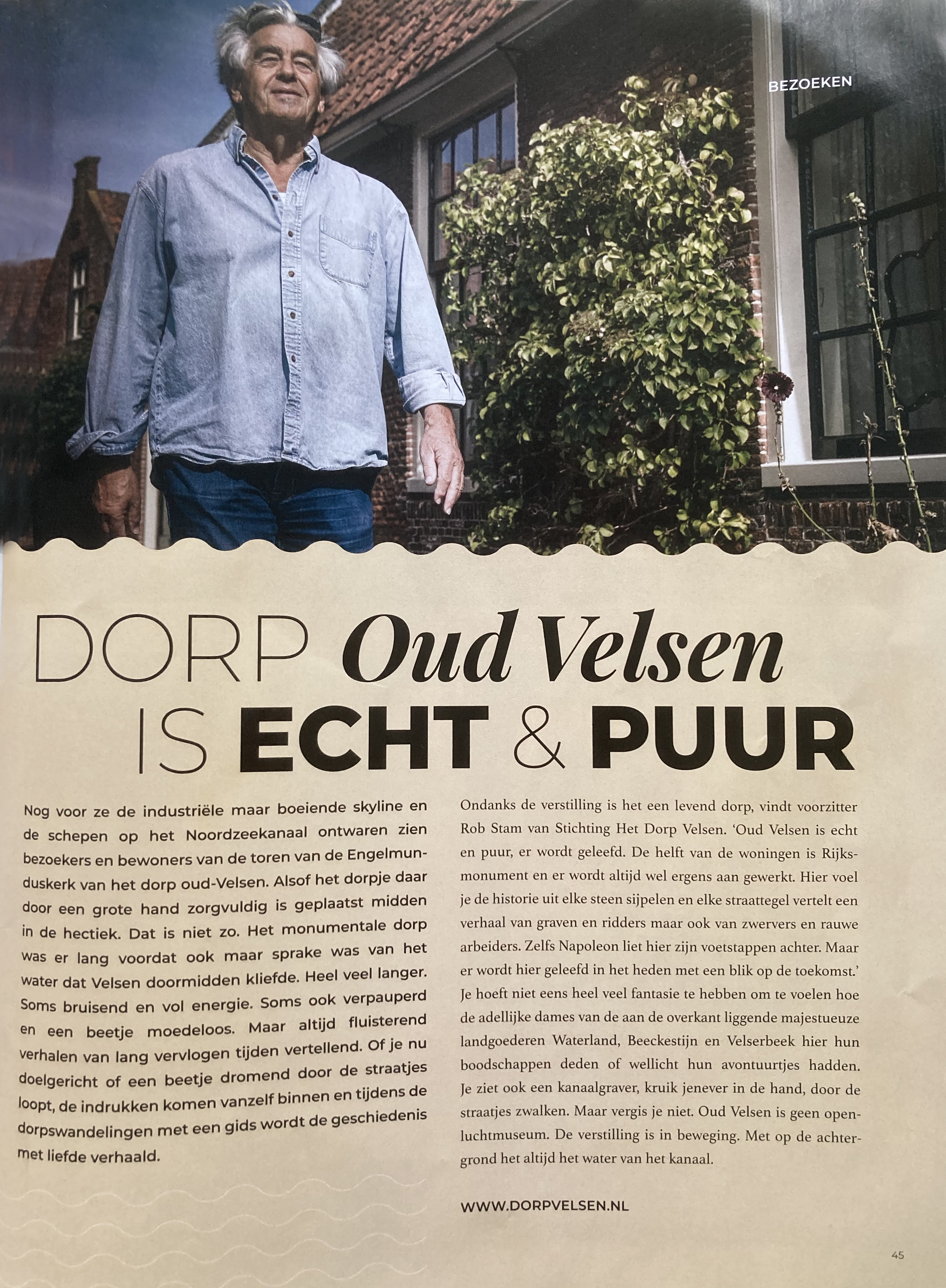 Ondanks de verstilling is het een levend dorp, vindt voorzitter Rob Stam van Stichting Het Dorp Velsen. ‘’Oud Velsen is echt en puur, er wordt geleefd. De helft van de woningen is Rijksmonument en er wordt altijd wel ergens aan gewerkt. Hier voel je de historie uit elke steen sijpelen en elke straattegel vertelt een verhaal van graven en ridders maar ook van zwervers en rauwe arbeiders. Zelfs Napoleon liet hier zijn voetstappen achter. Maar er wordt hier geleefd in het heden met een blik op de toekomst.’’ Je hoeft niet eens heel veel fantasie te hebben om te voelen hoe de adellijke dames van de aan de overkant liggende majestueuze landgoederen Waterland,  Beeckestijn en Velserbeek hier hun boodschappen deden of wellicht hun avontuurtjes hadden. Je ziet ook een kanaalgraver, kruik jenever in de hand, door de straatjes zwalken. Maar vergis je niet. Oud Velsen is geen openluchtmuseum. De verstilling is in beweging. Met op de achtergrond het altijd voortjagende water.